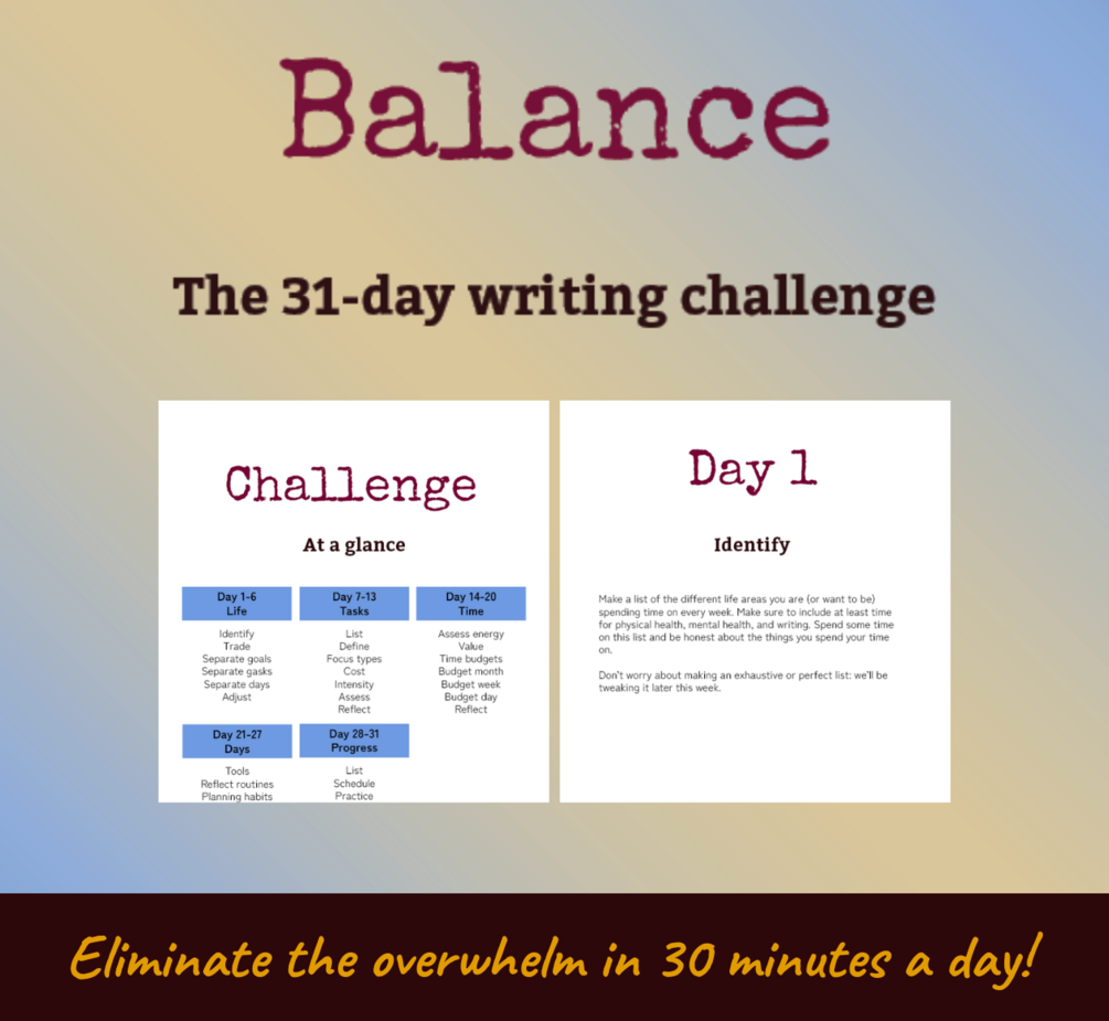 This 31-Day Challenge will help you recover your writing joy and eliminate the overwhelm by creating balance in your writing life!