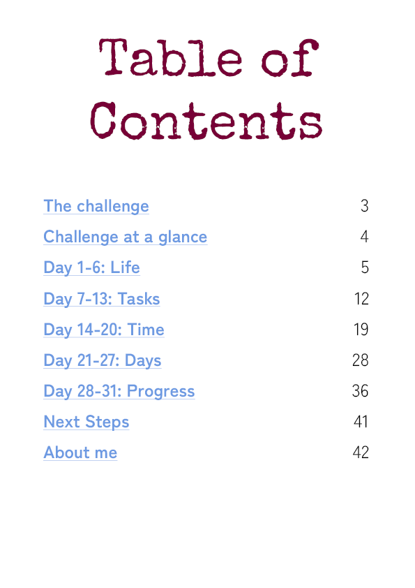 A one-page introduction; A one-page overview the weekly and daily themes; 5 week-bundles: a cover page for the week, plus a one-page explanation of the day’s exercise for every day in this week; Suggestions for next steps; An “About me” page.