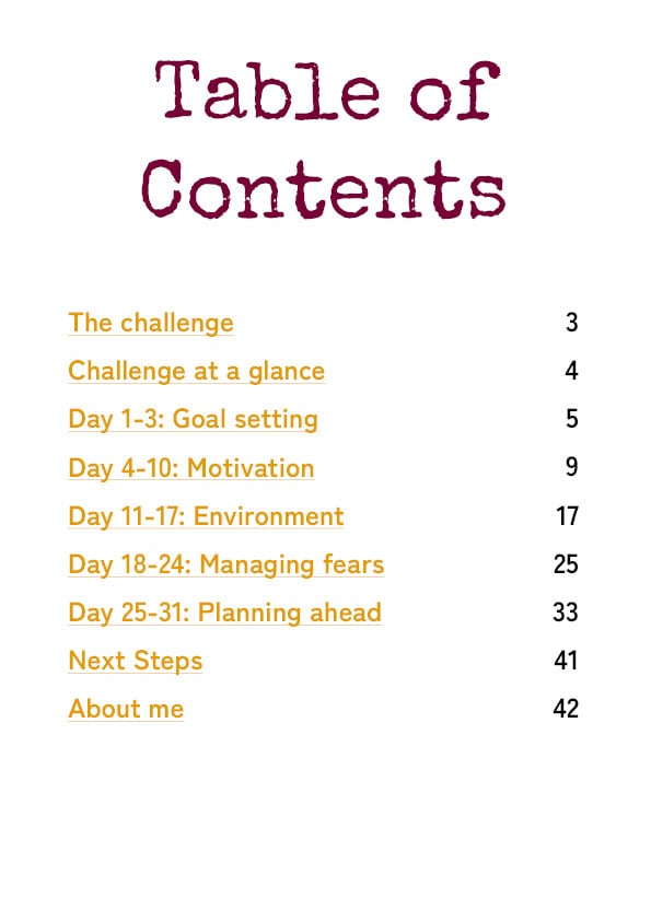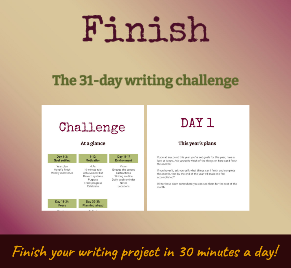The 31 exercises in this writing challenge can be done in less than 30 minutes. They will help you set achievable goals, optimize your writing process, finish your project, and achieve your writing goals.