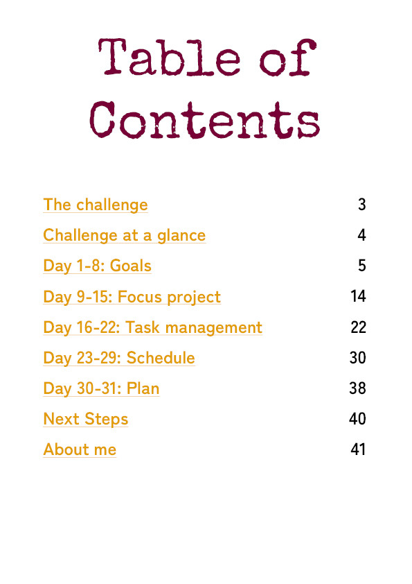 A one-page introduction; a one-page overview of the weekly and daily themes; 5 week-bundles: a cover page for the week, plus a one-page explanation of the day's exercises for every day this week; suggestions for next steps; an "about me" page.