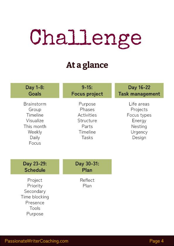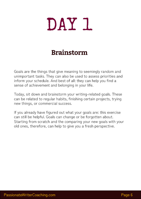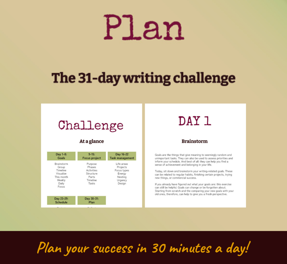 • The challenge was designed by a professional writing coach who specializes in planning and mindset exercises. She developed and tested the exercises over the course of years, resulting in great success for the writers she works with.