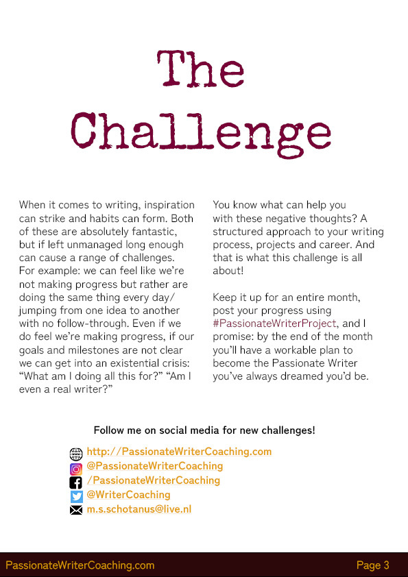 - The challenge was designed by a professional writing coach who specializes in planning and mindset exercises. She developed and tested the exercises over the course of years, resulting in great success for the writers she works with.