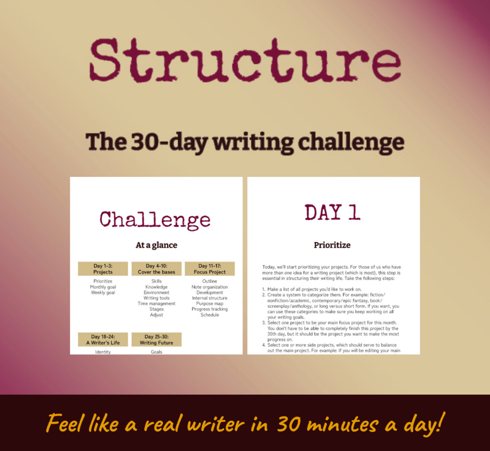 When you first start writing, you usually feel your way around, trying to see what does and doesn’t work. But as you start taking your writing life more seriously, you’ll find that you need a bit of structure if you want to feel you’re making progress. Yet, even long-term writers fall out of their structures and systems, or end up finding they stop working for them. That is why I designed this 30 day challenge: to help you reflect on and create the structure you need to become your most productive writer-self.