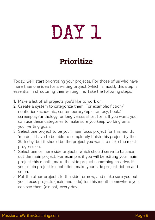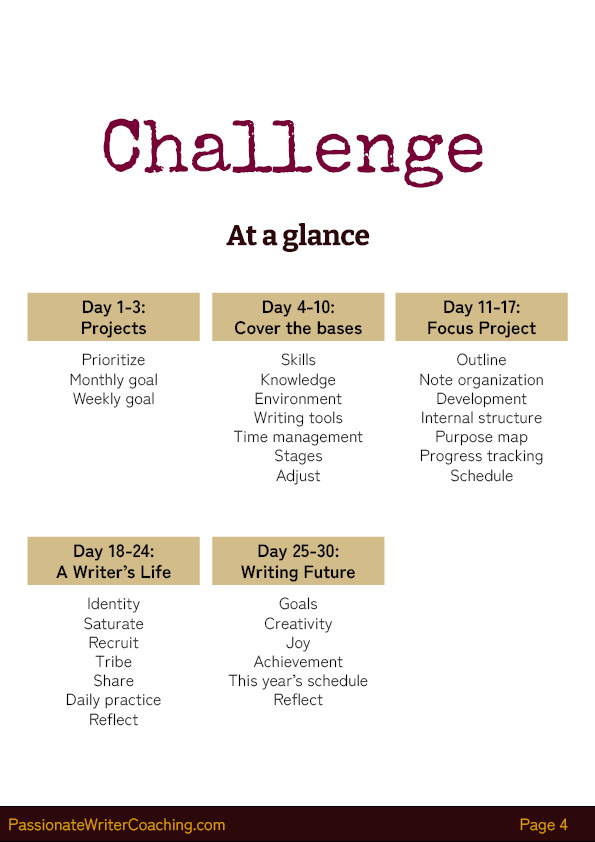 - The challenge was designed by a professional writing coach who specializes in planning and mindset exercises. She developed and tested the exercises over the course of years, resulting in great success for the writers she works with.